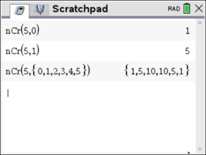 On the screen, you will now see a "list" of the combination values (in order) to be used in calculating the coefficients for the 6 terms in the binomial expansion for this problem. Nice!!