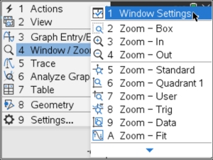 1. You can change the window settings ON the window itself. Just double click on the value labeled at the ends of each axis and alter it to your new desired value.